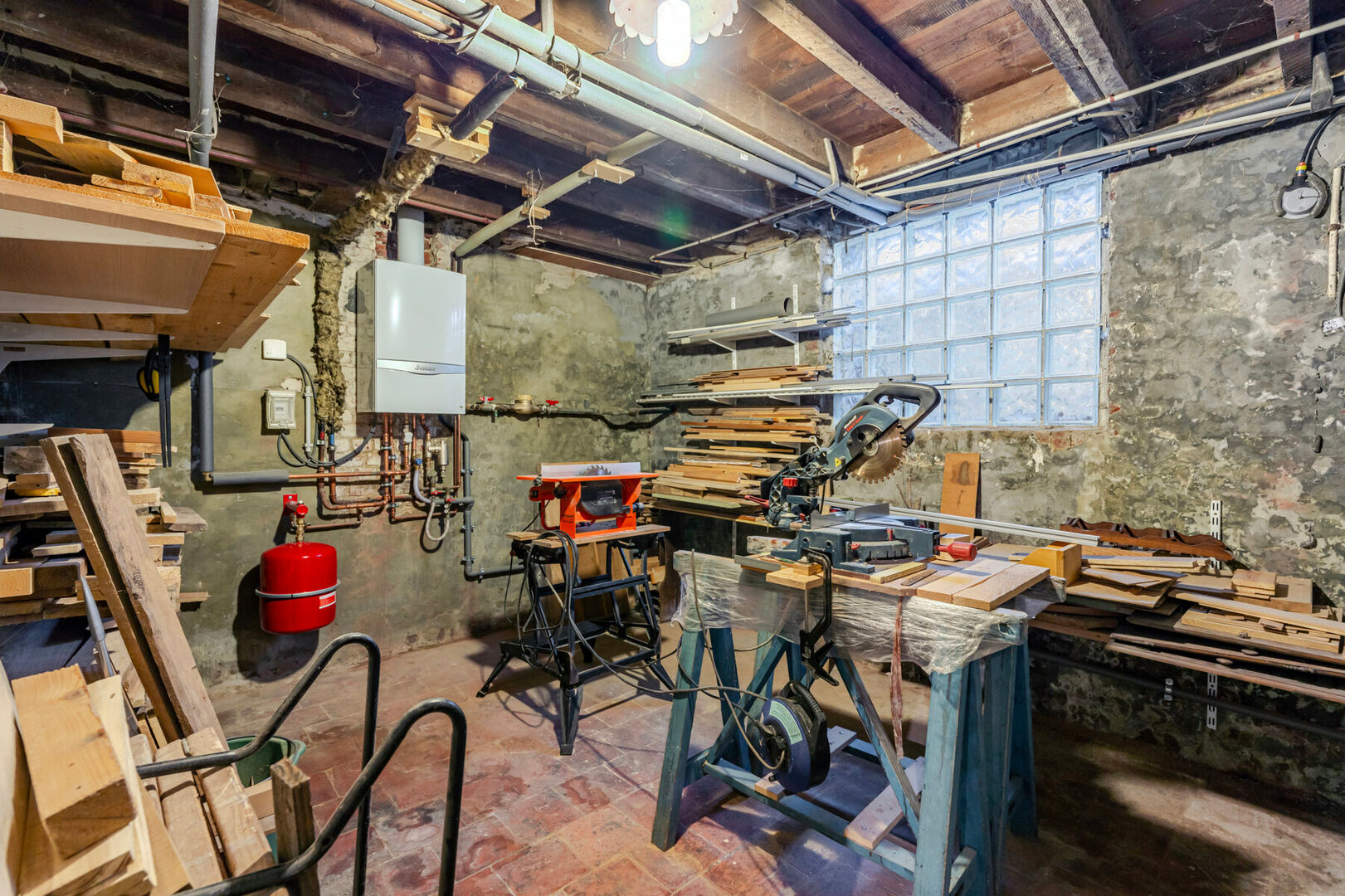 Through the entrance hall, you enter the first living area, which is spacious and pleasantly arranged with a clear separation between the sitting and dining areas. Large windows provide an abundance of natural light, while the warm flooring and neutral tones create a comfortable and welcoming atmosphere. Adjacent to this space is a multi-purpose room offering many possibilities: it can easily be used as an additional bedroom, home office, hobby room, or an extension of the living area. The ground-floor bathroom is practical and well maintained, featuring a spacious shower, a stylish bathroom unit with mosaic finish and countertop washbasin, ample storage space, and a toilet. Behind the bathroom, there is an additional storage area that can be used as a workshop or workspace and offers direct access to the street via a separate door.