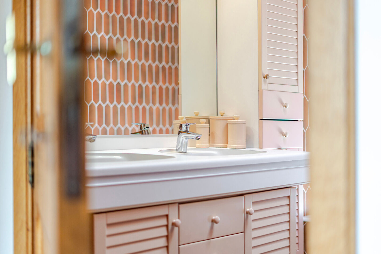 Ce niveau comprend également une salle de bains avec baignoire et meuble lavabo, un WC séparé et un garage intégré pour une voiture.